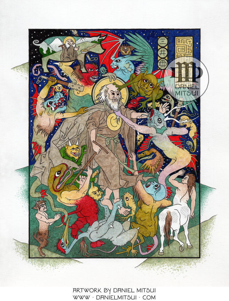 Although I imitated this composition somewhat in my picture, I drew in the style of Japanese woodblock prints, particularly those of the ukiyo-e master Utagawa Kuniyoshi. St. Anthony here wears a small gong around his neck, rather than the usual bell, and carries a striker in the shape of his familiar tau staff.