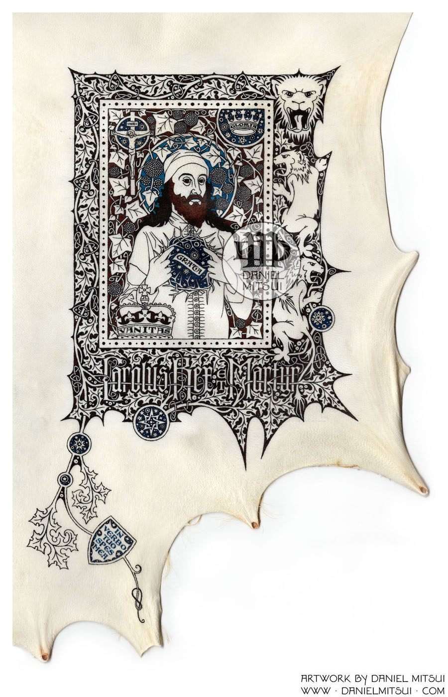 Contemporary depictions of Charles’s beheading show him dressed in relatively plain clothes, and I took this as a detail probably attested by eyewitnesses. I read also that after Charles’s barber was dismissed by Parliament, he refused to let anyone else shave him or cut his hair (presumably fearing assassination); therefore, I drew his hair and beard somewhat longer than they appear in his most familiar portraits.