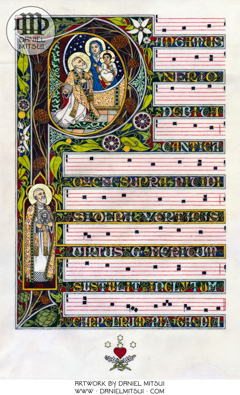 There is a large inital letter P that dominates the page; inside it I drew the Blessed Virgin Mary appearing to St. Philip in 1594. In the P’s downstroke I drew St. Philip, holding an alabaster tablet of St. John the Baptist’s head. This refers to an earlier vision, one of St. John the Baptist that St. Philip saw in 1550. (Also, I was once told that a Nottinghamshire alabaster of St. John’s head is in the collections of the Oratory in Rome; this was one discovered in the belongings of one of the defeated Turks after the Battle of Lepanto. How or why the Turk came to own it God only knows.)