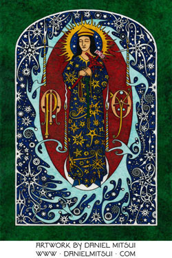 My artistic intention was to connect this recent apparition to the older medieval iconography of the Blessed Virgin Mary: the Woman of the Apocalypse, the Immaculate Conception and the Virgin of Parturition. She has a solar halo with twelve stars, and a crescent moon beneath her feet. The ΜΡ ΘΥ inscription is the Greek nomina sacra for the Mother of God that appears in traditional icons. I did my best to depict the stars as dynamic, varied and interesting.